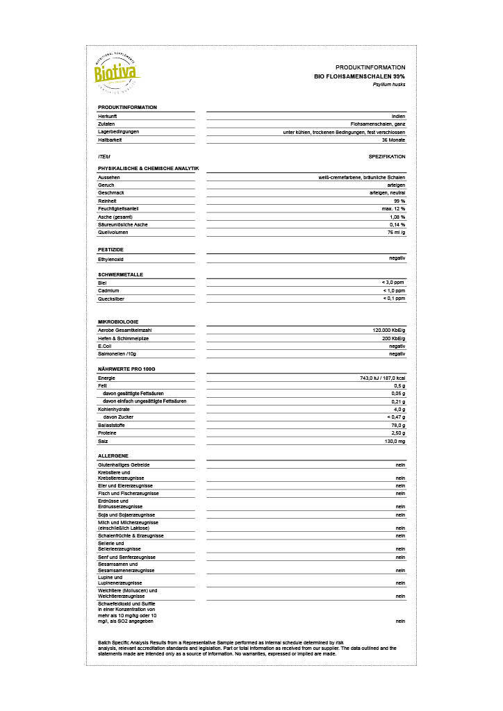 100% Flohsamenschalen ganz (Plantago psyllium) aus kontrolliert biologischem Anbau (DE-ÖKO-005)