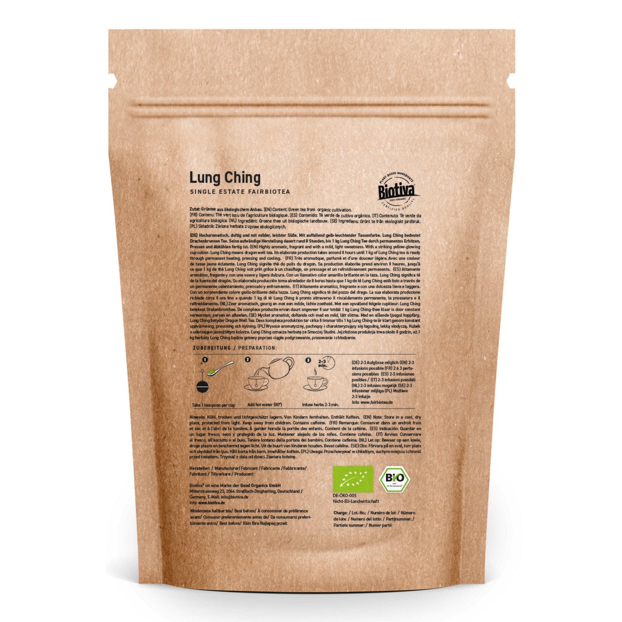 Hocharomatisch, duftig und mit einem milden, leicht süßlichen Geschmack. Ein Lung Ching, der auch nach mehreren Aufgüssen durch seine Geschmacksvielfalt überraschen kann. Er hat eine auffallend gelb-leuchtende Tassenfarbe. Lung Ching heisst übersetzt Drachenbrunnen Tee. Dieser Name soll sich aus der Form der Blätter abstammen, die an fliegende Drachen erinnern. Die Herstellung dieses Lung Ching ist sehr aufwändig. Er wird von Hand verarbeitet, so dass jedem einzelnen Blatt besondere Sorgfalt zukommt. Zu Beginn wird der frisch geerntete Tee immer wieder in wokähnlichen Pfannen mit den Händen gepresst und anschließend abgekühlt. Es dauert rund 8 Stunden, bis 1 kg Lung Ching Tee durch permanentes Erhitzen, Pressen und Abkühlen fertig ist.