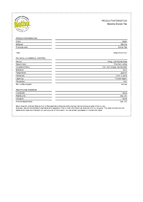 Bancha ist in Japan der Begleiter durch den Tag. Im Spätsommer und gegen Ende der Tee-Saison werden die großen, etwas älteren Blätter gepflückt. Diese haben einen sehr geringen Gehalt an Koffein, dafür aber verhältnismäßig viel Eisen, Kalzium und Gerbstoffe. Unser Biotiva Bancha Grüntee besitzt ein kräftiges, frisches, leicht grasiges Aroma und ist auch kalt ein echter Genuss. Die Gehaltsstoffe und sein kräftiges Aroma machen diesen Bancha zu einem beliebten Familiengetränk.