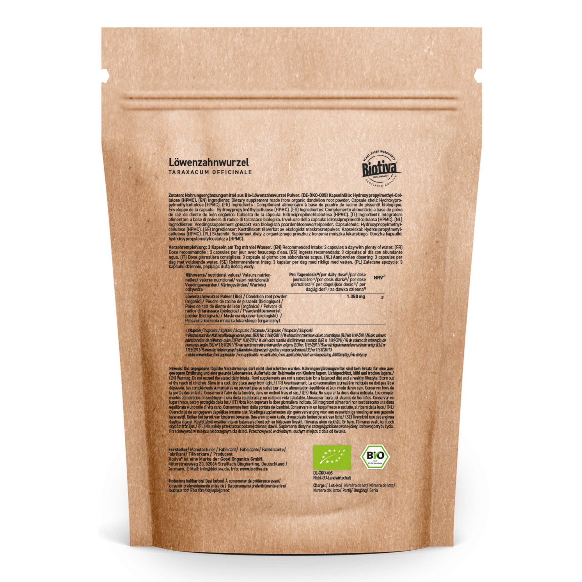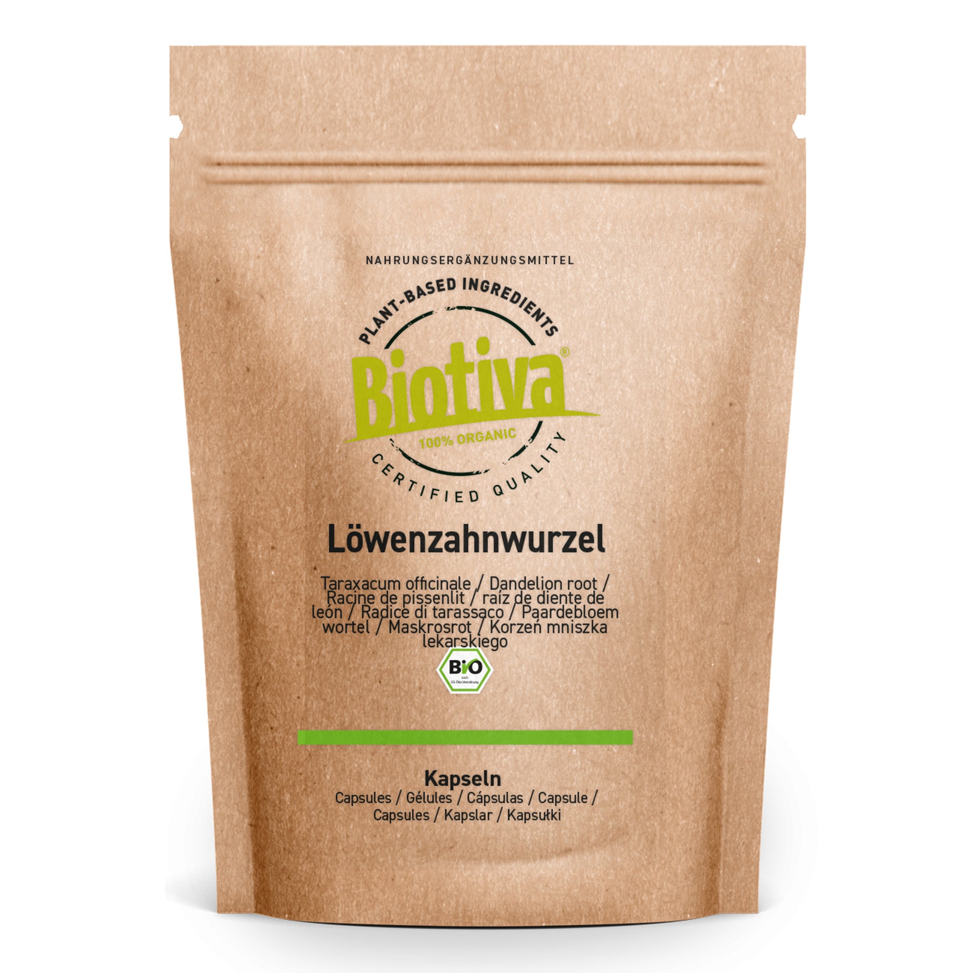 100% Löwenzahnwurzelpulver (Taraxacum) aus kontrolliert-biologischem Anbau (DE-ÖKO-005). Kapselhülle: Hydroxypropylmethyl-Cellulose (HPMC)