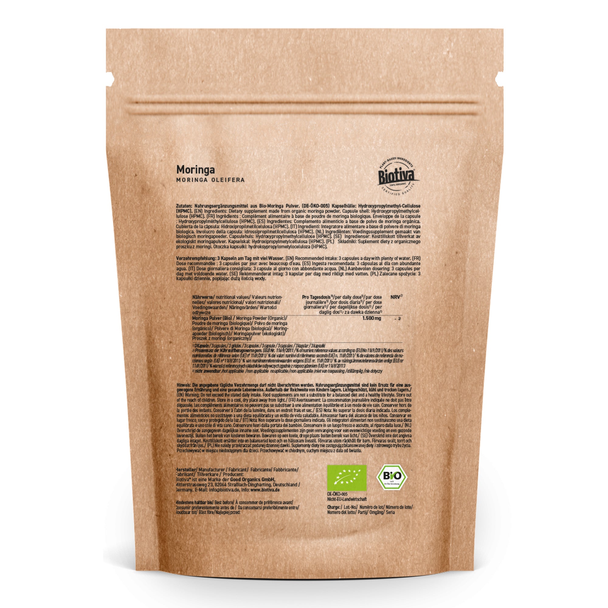 100% Moringa Oleifera Pulver aus kontrolliert-biologischem Anbau (DE-ÖKO-005). Kapselhülle: Hydroxypropylmethylcellulose (HPMC)
