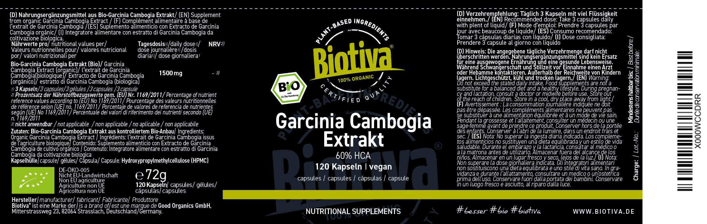 100% Garcinia Cambogia Extrakt Pulver, Kapselhülle: Hydroxypropylmethyl-Cellulose (HPMC)